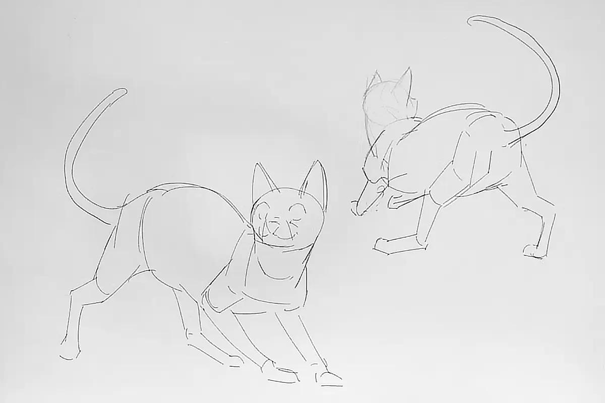 Now that we have the shapes and simple form in mind and the general flow and gesture of a cat we can bring these two together! Using a reference you will draw the loose gesture then add the general structure on top! Keep it loose. Remember if it's a struggle then you are learning!