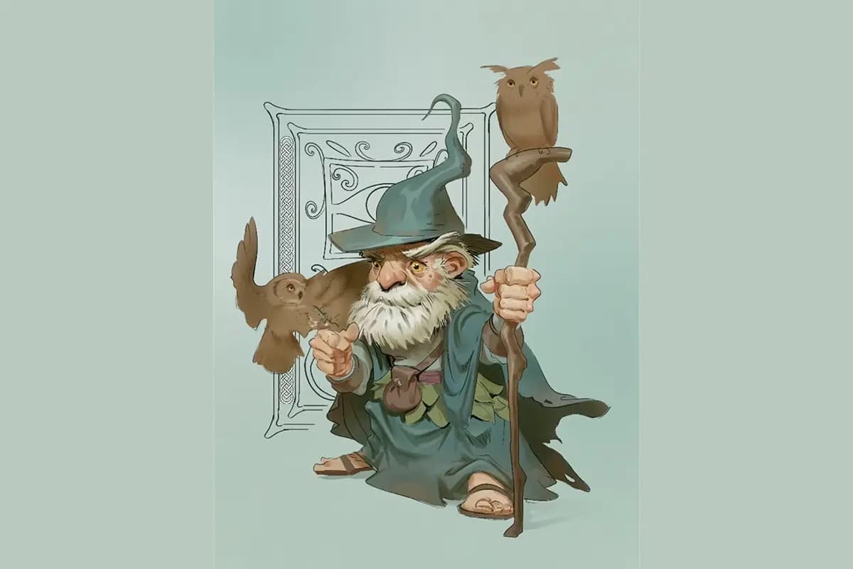 Druiden in D&D verkörpern die Natur, also lass dein Design davon inspirieren! Statt eines langweiligen Zauberhuts, versuche Formen zu nutzen, die an Zweige oder Tiermerkmale erinnern. In diesem Beispiel ließ sich der Künstler von einer Eule inspirieren und hat dem Zwerg die Gesichtszüge einer Eule gegeben: eine schnabelartige Nase und sogar eulenartige Muster um Bart und Augen. Finde Ideen in der Tierwelt oder in Pflanzen und verwende diese Formen in deinem Kostüm- und Accessoire-Design für deinen Charakter.