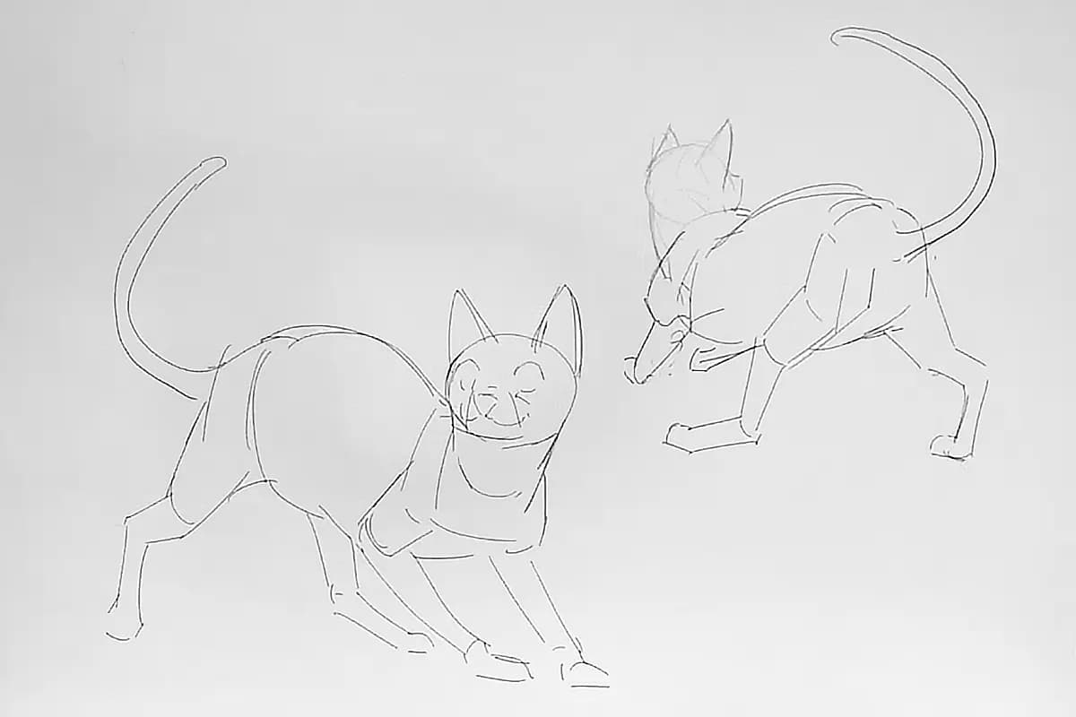 Nun, da wir die Struktur und die Grundbausteine sowie die Bewegung und Gestik der Katze verstehen, ist es an der Zeit, beides zu kombinieren! Erstelle zunächst eine lose Zeichnung vom Referenzbild und lege