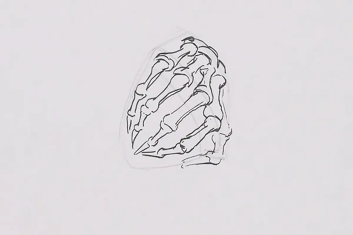 Ensuite, prends une image de référence ou utilise ta propre main comme guide pour commencer à dessiner le squelette de la main. Concentre-toi sur les trois principaux types d'os : les phalanges (doigts), les métacarpiens (paume) et les carpiens (poignet). Prête attention à la façon dont les doigts se plient et à la façon dont le pouce se déplace différemment des autres doigts. Cela peut prendre un certain temps, mais ne te précipite pas : c'est au cours de ces études que tu constateras d'énormes améliorations dans tes compétences en dessin. À la fin, tes mains squelettiques seront peut-être même prêtes pour les décorations d'Halloween !